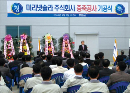 태양광전지 생산분야 선두기업 미리넷솔라(대표 이상철, www.millinetsolar.com)는 지난 9월 2일, 대구시 성서공단 내 생산공장 부지 내 2기 150MW라인 구축을 위해 본 양산중인 30MW에 더해 120MW의 생산라인 증설 기공식을 진행했다. 내년 5월까지 총 800억여 원이 투입되는 2기 태양광전지(솔라셀 Solar Cells) 생산라인은 현재 대구공장 부지 36,921m2(11,169 평)의 동쪽에 연 건축면적 11,157m2(3,375평) 규모로 구축할 계획이다. 이번 증설에도 앞선 1기 라인과 마찬가지로 최첨단 전자동 인라인 제조방식(fully automated in-line process line)을 채택했고, 공장증축이 완료될 경우 현재 연간 800만장으로부터 연간 4,100만장의 다결정 태양광전지를 확대·생산하게 된다. 이상철 미리넷솔라 대표이사는 “정부가 ‘저탄소 녹색성장’비전을 이루기 위해 태양광 등 그린에너지산업을 국가정책산업으로 선정, 신성장동력으로 육성키로 하고 민-관으로부터 설비와 연구개발(R&D)에 111조를 투자하기로 함에 따라 이에 발 맞춰 미리넷솔라도 대규모로 투자해 기가(GW)급 생산라인을 확충해 나가겠다”고 전했다.