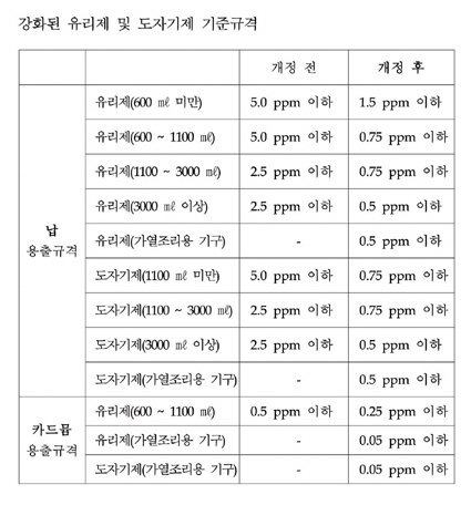 기존의 유리제, 도자기제 및 법랑재질의 기구 및 용기포장에 대한 용량 크기를 세분화(1100㎖ 미만, 1100㎖ 이상 ⇒ 600㎖ 미만, 600~3000㎖, 3000㎖ 이상)하여 납 및 카드뮴 용출규격을 강화하였고, 유리제, 도자기제 및 법랑재질의 제품을 불에 직접 가열하는 ‘가열조리용 기구’ 에 대해서도 납 및 카드뮴의 용출규격을 신설했다.