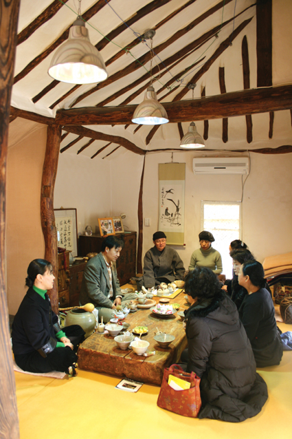 다음으로 찾은 곳은 토야요로 현재 밀양도예가회장으로 있는 도예가 송승화의 다실. 운치있는 초가집이 낮은 담장너머로 엿보이는데 검둥이강아지 네마리가 앞뜰에서 뛰어노는 모습에서 평화로움이 물씬 풍겨난다. 디딤돌을 딛고 툇마루에 올라서 폭도 좁고 키도 작은 문에 허리를 낮게 숙여 들어서자 방한칸에 아담한 다실이 온전히 드러난다. 부엌과 온돌방 한칸이었던 구조를 한 공간으로 터 다실과 진열공간으로 꾸몄다. 아치형의 천장에는 온전히 서까래가 드러나고 은은한 빛의 조명을 달아 마치 엄마뱃속같은 포근하고 아늑한 느낌이랄까. 나즈막한 다상을 중심으로 둘러앉으니 말차를 준비하는 작가의 손길에 시선들이 모아진다. 가루차를 넣고 탕수를 부은 다음 차선으로 휘저어 거품을 만들고 그 거품과 함께 마시고 나서는, 백탕기에 담긴 물을 부어 다완바닥에 깔려있는 말차를 말끔히 마시기까지. 이 과정은 차문화가 단순한 의미의 음료가 아닌 총체적인 문화임을 알 수 있다. 때와 장소, 누구와 마시느냐에 따라 많은 요소들이 달라지며 그만큼 다양한 찻자리가 있는 것이다.