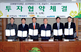 지난달 3일 박준영 도지사와 정종득 목포시장, 솔믹스(대표 주광일), 비에이치세미콘(대표 장안재), 씨에라인더스트리(대표 이달군), 신일세라믹스(대표 이상소) 4개의 세라믹분야 기업과 투자협약을 체결했다. 비에이치세미콘은 부지 9,900㎡에 본사이전 및 공장설립을 위해 100억원을 투자하고, 씨에라인더스트리는 부지 6,600㎡에 본사이전 및 공장설립, 90억원 투자, 솔믹스는 부지 6,000㎡에 50억원의 신규사업 투자, 신일세라믹스는 부지 5,000㎡에 본사와 공장을 이전하고 50억원을 투자하는 등 160여명의 고용창출을 기대할 수 있게 됐다.