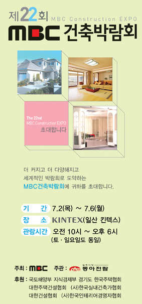 (주)동아전람이 주관하는 「동아전람 - 제22회 MBC건축박람회」가 오는 7월 2일부터 7월 6일까지 5일간 전시품목이 더욱 다양해지고, 국제적인 규모로 일산 KINTEX에서 개최된다.