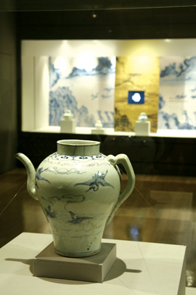분원백자전에 출품된 「백자청화장생문주자형대호白磁靑畵長生文注子形大壺」
