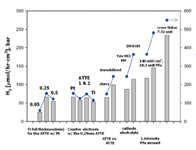 현재까지 본 연구를 통하여 아래와 같은 추이의 결과 발전을 이루었다. 기본 광어노드 면적(cm2)에서 시간당 약 240umol의 수소가 발생한다는 의미는 산술적으로 100m×100m의 면적이라면 태양빛이 존재하는 약 6.5시간 동안 3.5백만리터(약 310Kg)의 수소를 얻을 수 있어 500km 주행할 수 있는 자동차 53대 정도를 충전할 수 있는 양이다.