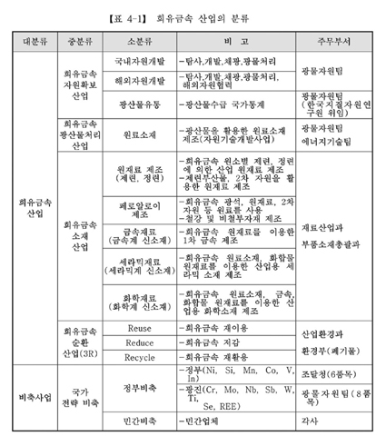 희유금속 광물 및 자원을 탐사·개발하고 산업사회에서 필요한 원재료, 금속재료, 세라믹재료, 화학재료 등을 제조·공급하며 희유금속 자원의 순환 및 안정공급에 기여하는 일체의 산업군으로 정의함.