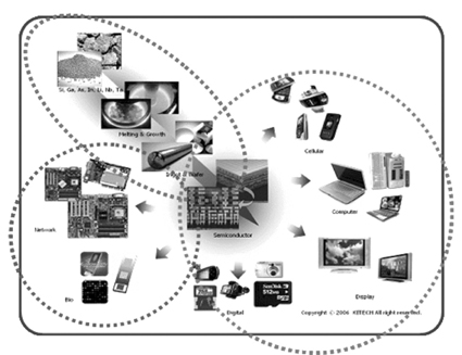 ■ 전기전자 산업에서 희유금속은 반도체, 디스플레이, 휴대기기 등 전기전자 제품에 사용되는데, 휴대폰 및 디스플레이 등 국가의 주력 수출 전기·전자 산업 제품 및 최근 터치스크린 및 신조명으로 각광받고 있는 LED 등에 사용되는 인듐(In), 이트륨(Y), 갈륨(Ga), 비소(As) 등 희유금속이 포함된 소재를 희유금속을 의미함.