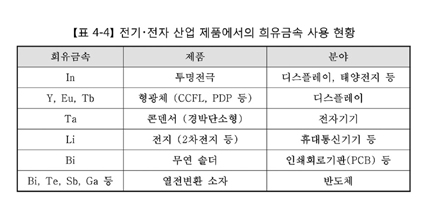 표 4-11. 전기·전자 산업 제품에서의 희유금속 사용 현황