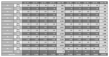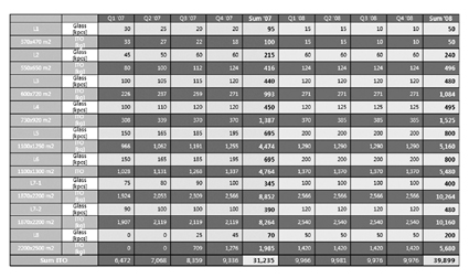 ■ 5인치당 1g의 인듐소요(일본공업레어메탈)를 기준으로 각 라인별 유리기판의 크기와 투입량을 참고로 계산하면 다음 표 4-6 및 표 4-7와 같음.
