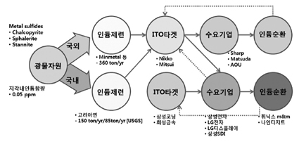 ■ 이 폐타겟은 고순도, 고가의 인듐을 함유하고 있으므로 타겟업체에서는 이를 정제하여 재사용하는 리사이클링공정을 거쳐 산화인듐분말로 재활용하게 됨. 폐타겟의 리사이클링공정에서는 1차로 고순도 금속인듐으로 정제하며 이를 원료로 다시 산화인듐 분말을 제조하는 2단계를 거치는 것이 보통임. 따라서 리사이클링 비용이 많이 들게 되므로 최근에는 폐타겟에서 직접 산화 인듐분말을 합성하는 방법이 연구되고 있음.