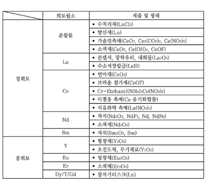 ■ 희토류 응용제품이 첨단산업에 매우 중요한 원자재임에도 불구하고 국내에서 확보중인 응용기술 및 설비는 경희토류 정광을 가공한 연마재 생산 등에 불과함. 따라서 향후 수요 증가가 예상되는 영구자석, 수소저장합금 및 형광체 그리고 기능성 희토류 소재 등에 대한 응용기술 확보가 필요한 상황임.