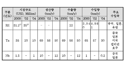 ■ 국내의 경우 현재 탄탈륨의 경우 커패시터용으로 삼성전기 및 대우 파츠닉에서 분말 형태로 수입하여 커패시터를 제조하고 있는 중임.