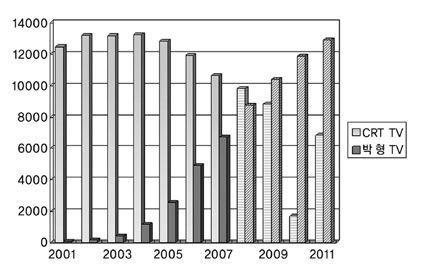 그림 4-10. CRT 및 LCD, PDP TV (10인치 이상) 생산 추이 예측