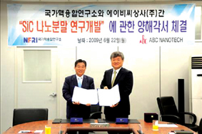 국가핵융합연구소(소장 이경수)는 지난달 22일 핵융합에너지 연구개발과정에서 얻은 기술인 탄화규소(SiC) 나노분말 제조공정 상용화를 위해 에이비씨 나노텍(대표 이종만)과 양해각서(MOU)를 교환했다고 밝혔다. 이번 협약으로 연구소측이 핵융합에너지 연구개발 과정에서 얻은 파생기술 중 하나인 SiC나노분말 제조공정의 상용화 타당성을 분석하고, 타당성이 입증될 경우 상용화를 위한 연구개발에 착수하게 된다.