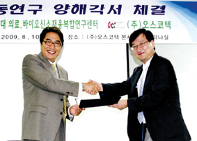 강원대 의료·바이오 신소재 융복합 연구센터(센터장:이한수 교수)와 뼈전문 신약개발기업 (주)오스코텍(대표:김정근)은 지난달 10일 오스코텍 본사 세미나실에서 포괄적 양해각서를 체결하고 치과용 신소재를 포함하는 의료용 신소재 개발 및 신약개발을 공동으로 진행키로 했다고 밝혔다. 이번 양해각서 체결은 오스코텍의 뼈·관절 관련 신약 및 소재 개발 기술과 강원대 의료·바이오 신소재 융복합 연구센터의 폭넓은 인프라와 우수한 인재 등의 장점을 결합해 의료용 신소재 공동연구 및 신약 공동개발에 속도를 낼 것으로 전망했다.