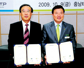 충남테크노파크(원장 김학민)는 지난달 9일 본관 대회의실에서 나노종합팹센터(소장 이희철)와 나노ㆍ반도체 기술의 연구개발을 비롯, 산업화 및 디스플레이센터와 자동차센터 등과 전략적 기술협력을 추진하기 위한 협약을 체결했다. 이에 따라 두 기관은 △충청권 나노 및 반도체 기술분야 유망기업 발굴 및 육성 △산학연 협력 프로젝트 공동연구 및 연구인력 교류 △연구시설ㆍ장비 상호활용 및 인력양성 교육지원 △국내외 기술정보 수집 조사연구 및 정보공유 등을 추진하게 된다.