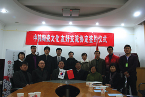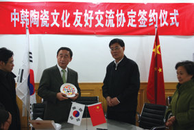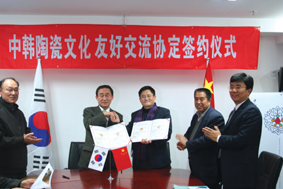 방문단은 가장 먼저 ‘민간문예가협회CFLAS’로 향했다. 참고로 ‘민간문예가협회’는 중국문련중국문화예술계연합회의 산하기관으로 중국민간예술영역의 국가 주관기관이다. 중국민협의 본부는 북경에 있으며 주석은 문화부 및 문련 고위간부가 역임한다. 이곳은 중국 내 민간 예술문화의 보존, 지원, 계승, 발굴, 국제교류 등 모든 영역에서의 국가 관리기능을 이행하며, 산하기관으로는 34개 기관단체 및 8천여명의 소속회원, 30여개의 민간예술협회, 50여개의 민간예술단지, 20여개의 박물관이 소속되어 있다. 협회 사무실에 들어서면서 먼저 눈에 들어온 것은 빨간색 천에 흰색 글자의 ‘중·한 협약식’ 현수막이었다. 재단 이사장은 ‘한국도자재단’을 한국을 대표하는 도자문화재단으로 인정할 것, 도자와 관련된 모든 문화교류는 재단을 통해서 이뤄질 수 있도록 할 것, 중국과 한국의 문화발전을 위해서 서로 협조하고 노력할 것을 골자로 하는 ‘MOU’ 내용을 제안했고 서로 동의하에 협약을 체결했다. 협상탁자 위의 중국 깃발과 한국 깃발이 나란히 서 있는 것을 보면서 ‘아, 우리가 정말 한국의 도자문화 교류 대표단으로 온 것이구나!’라는 비장한 마음에 자세를 바로 세웠다. 협약식이 끝나고 함께 기념촬영과 선물 교환을 했다. 우리가 준비한 선물은 중국의 선물처럼 화려하지는 않았지만 우리 재단의 직원들이 직접 만든 접시에 우리재단의 지난 역사를 담고 있으며 재단의 개혁을 상징하는 의미를 담고 있다고 설명했다.