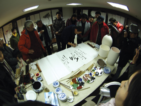 아침 8시 식사 후 ‘민룡도자관民龍陶瓷館’으로 향했다. 날씨가 너무 추워 머리가 저릴 정도였다. 20만 평방미터의 건물에 전국 80%지역의 대표 도자기들을 모두 모아 놨다. 세미나실과 워크샵 공간 그리고 복도에 시연장을 갖추고 있었다. 이곳은 중국 공예가협회의 산하기관으로 작년에 오픈했다고 한다. 경덕진, 불산, 의흥 지역의 낯익은 도자기들도 보였고 건축, 조형, 생활, 회화도판 등 다양한 도자기들이 전시되고 있었다. 자체 전국단위 도자디자인 공모전을 개최하고 있으며 경매를 진행하기도 한다. ‘민룡도자관’의 관장은 재단과의 도자교류 및 재단 방문을 희망했다. 관장의 안내에 따라 위층으로 올라 중국의 서예대가 곽홍은郭鴻恩을 만날 수 있었다. 강우현 이사장과의 서예 진검승부가 즉석으로 이뤄졌는데, 서로의 느낌을 글로 주고받았다. 이사장의 거꾸로 써가는 글씨를 보고 흠칫 놀라는 눈치였다. ‘민간외교를 위해서는 장기하나는 꼭 갖고 있어야 하겠구나.’라는 생각이 뇌리를 스치는 순간이었다.