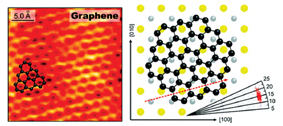 그림 (좌). 그라핀을 주사터널링현미경(Scanning tunneling microscopy , STM)으로 촬영한 사진, 모든 탄소원자의 위치가 에너지 평형상태로 존재한다는 것이 벌집모양의 패턴을 통해 확인 된다.