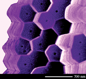 이하에서 티타늄 판재를 에틸렌글리콜(ethylene glycol)과 불산이 포함된 전해질에서 아노다이징했다. 이 방법을 이용해서 연구진은 2 차원의 육각형 격자 속에 정렬된 나노채널 어레이를 가진 자기 조립 표면 핵생성 층을 만들었다.