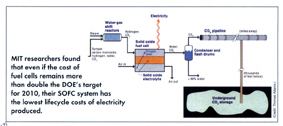 스를 SOFC에서 사용하기 적합한 형태로 만들어 주는 Gas Reformer와 SOFC로 유입되는 Gas에서 일산화탄소를 제거하는 Water-Gas Shift Reactor라는 장치를 사용한다는 점이다. 두 장치를 거쳐 SOFC로 유입되는 Gas는 일산화탄소를 포함하지 않기 때문에 일산화탄소의 유입에 따른 SOFC내 탄소 침착이 유발하는 SOFC의 성능저하를 근본적으로 막을 수 있다. 천연가스를 연료로 사용하는 SOFC 발전방식이라는 점에서 CO2의 발생은 피할 수 없지만 발전을 통해 발생되는 CO2는 매우 고순도 이기 때문에 매우 적은 에너지 손실만으로 지하 저장소에 효과적으로 보관할 수 있다고 한다. Thomas와 Adams는 천연가스를 이용한 발전방식과 함께 천연가스보다 값싼 석탄을 이용하는 방식 또한 고안해 냈다. 하지만 비교적 풍부한 천연가스 부존량과 석탄에 비해 매우 적은 이산화탄소를 배출하는 천연가스의 특성을 고려할 때 천연가스를 이용한 방식이 더욱 효과적이라는 결론을 내렸다고 한다. (MIT news를 통해 발표된 자료에 따르면 천연가스를 이용한 발전방식은 석탄을 이용한 방식의 1/3에 해당하는 CO2만을 발생시킨다고 한다.) Adams 와 Thomas는 컴퓨터 시뮬레이션 프로그램을 개발하고 이를 활용하여 그들이 고안한 발전방식의 경제적, 환경적 측면을 현재까지 고안된 다른 발전방식과 비교하였을 뿐 아니라 본인들이 고안한 두 가지 방식 (석탄 vs 천연가스)에 대한 비교 분석도 수행하였다. 분석결과에 따르면 SOFC 가격이 DOE가 예측하고 있는 2010년 SOFC의 가격의 2배로 유지될 경우에도 그들이 고안한 Gas-SOFC 발전방식은 (기존 발전방식의 3~4배에 이르는 초기 투자비용을 감안하더라도) 현재까지 개발된 발전방식 중 가장 경제적이고 친환경 적인 발전방식이 될 것으로 보인다. 컴퓨터 시뮬레이션 결과가 보여주는 더욱 놀라운 결과는 Gas-SOFC 발전방식이 탄소배출 비용을 제외할 경우에도 기존의 Gas연소 발전방식에 비해 저렴하다는 점이다. Adams와 Barton에 따르면 Gas-SOFC 발전방식은 탄소배출 비용이 톤당 5~10불 정도로만 형성되면 현재까지 알려진 가장 저렴한 발전방식인 석탄연소 발전방식보다도 경제적인 발전방식이 될 것이라고 한다. <그림> MIT의 연구원인 Thomas Adams와 Paul Barton가 고안한 천연가스-SOFC 발전시스템 ACB