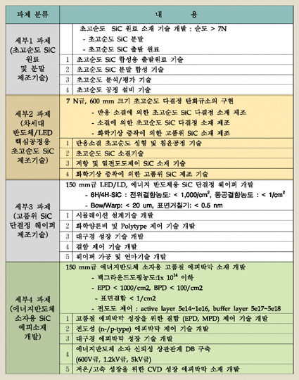 지난달 25일 현재. 8분과는 LG이노텍을 주관기업으로 하는 컨소시엄만이 접수된 것으로 전해지며, 9분과는 사파이어테크놀로지와 실트론으로 컨소시엄이 양분된 상태. 4개 세부과제로 구성된 SIC는 1세부 원료는 KIST, 2세부 벌크는 SKC솔믹스, 3세부 단결정은 포스코, 5세부 에피는 LG이노텍이 세부주관으로 컨소시엄을 구성. 총괄주관은 LG이노텍이 맡기로 했으며 OCI, 쌍용머티리얼, 이노세라는 참여기업의 형태로 컨소시엄에 합류한 상태. 큰 이변이 없는 한 SiC는 LG이노텍을 총괄주관으로 하는 사업단이 최종 선정될 것으로 예상되는 상황이다.