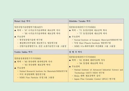 초빙 인사로는 일본물질재질연구기구(NIMS)에서 활동 중인 장병국 박사를 필두로 같은 연구원의 Hidehiko Tanaka박사, Yoshio Sakka박사 그리고 일본 산업기술종합연구원(AIST)의 Watari Koji박사 등 일본내에서도 손꼽히는 비산화물 세라믹분야의 전문가들이 초청됐다.