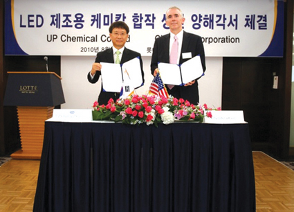 유피케미칼은 미국의 켐추라와 고휘도 발광다이오드(LED) 제조용 금속유기 화합물을 생산·판매할 합작사 설립을 위한 양해각서(MOU)를 체결했다고 지난달 24일 밝혔다.