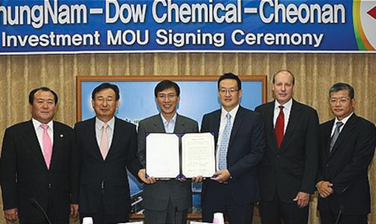 충청남도는 지난달 18일 충남도청 영상회의실에서 안희정 지사와 박한규 천안시 부시장, 도미니크 양 다우케미컬 전자재료사업부 총괄사장, 브루스호크너 다우케미컬 신소재사업부 아·태지역 대표와 발광다이오드(LED) 및 디스플레이 핵심소재 생산공장 설립에 관한 양해각서(MOU)를 교환했다고 밝혔다.