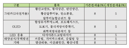 지난 8월 29일 지식경제부는 2차전지에 사용되는 황산코발트와 황산망간, LED에 쓰이는 다이아몬드코팅와이어, 태양전지와 풍력발전에 필요한 탄산이나트륨 등 20개의 신성장 분야 원자재와 부품 등 37개 품목에 대해 관세를 낮추는 안이 기획재정부의 ‘2010 세제개편안’에 포함됐다고 밝혔다.