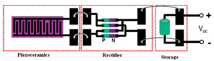 이스라엘의 대표적인 에너지 하베스팅 시스템 개발회사인 INNOWATTECH은 도로, 철로, 통행로나 무거운 기계류 하단에 압전체를 이용한 발전모듈을 설치하여 국부적인 발전이나 그리드 전력에 이용이 가능한 발전시스템을 개발하고 있다.[그림 4 참조] 이들이 개발한 압전발전기인 IPEG(Inno
