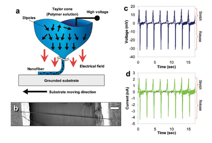 미국 캘리포니아 대학 버클리대학의 Liwei Li 교수팀은 PVDF를 이용하여 각종 의류나 직류에 포함될 수 있는 섬유 나노발전기를 생산했다. 이 압전 나노섬유들은 의류 형태로 제작되어 기계적 힘에 의한 변형을 통해 전기 에너지로 전화되어 소형 전자기기에 전력을 제공할 수 있다. 신체의 미세한 움직임만으로도 간단한 전자기기를 구동할 수 있으며 이들 나노섬유들은 유기물질로부터 제작이 가능하여 낮은 단가로 제작이 가능하기 때문에 경제적일 뿐만 아니라 유연하기 때문에 더욱 가치가 있다.[12] [그림 11 참조]