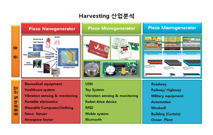 압전 에너지 하베스팅 기술은 환경과 에너지의 중요성에 대한 인식이 부각되면서 최근 관심이 커지게 되었다. 도로, 철로, 활주로 등 각종 교통수단을 통해 이동 시 발생하는 미활용 에너지의 매크로 하베스팅에서부터 음파, 심장박동, 혈압 등 각종 인체활동의 미세한 진동을 이용한 에너지 나노 하베스팅에 이르기까지 압전 세라믹을 이용한 에너지 하베스팅 기술은 각종 전자산업, 자동차, 에너지 산업 등의 전 산업분야에서 다양하게 활용될 것으로 기대된다.