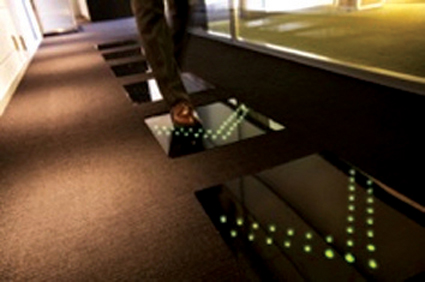 일본의 음력발전(www.soundpower.co.jp)이라는 기업에서는 압전스피커가 작동하는 원리로부터 발상의 전환을 통하여, 사람이 이동할 때 발생하는 진동 효과를 진동판을 사용하여 극대화함으로써 압전체를 통해서 전기가 발생되도록 하였다. 그림 3은 음력발전사에서 제작한 발전판의 모습과 이를 응용한 여러 응용사례를 나타내고 있다. 그림 3의 압전 발전판은 가로, 세로, 두께가 각각 20cm×30cm×3cm에서 60 kg의 체중을 가진 사람이 보행 시 약 0.3~0.5W 급의 발전을 할 수 있다고 한다. 이를 이용하여 사람이 이동이 잦은 통행로나 지하철의 개찰구 등에 설치하여 하루 약 6000Ws 전력을 생산하였다고 하며 차량의 이동하중을 이용하여 동