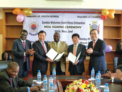 이번 MOU 체결은 지식경제부 아프리카 민관협력사절단의 일원으로 잠비아를 방문한 주식회사 한진피앤씨 이종상 회장과 함께 박영준 지식경제부 차관과 MAXWELL MWALE 잠비아 광산부 장관이 입회하여 진행되었다.