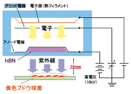 일본 물질재료연구기구 광재료센터의 타니구치와 와타나베 연구원 등은 후타바전자공업(주)과 공동으로 물질재료연구기구의 보론 나이트라이드(hBN)의 미분말과 후타바전자공업의 캐소드를 조합시킨 캐소드발광 방식의 원자외선 발광디바이스를 이용하여 황색포도상균의 살균시험을 실시한 결과, 60초의 자외선 조사로 99.99% 이상의 살균능력이 있다는 것을 확인하였다. hBN은 화학저으로 안정, 무해한 재료로 환경친화적이며, 수은을 사용하지 않는 원자외선 발광디바이스에 이용되는 발광재료이다. 원적외선 발광디바이스는 광촉매에 의한 환경오염물질의 분해처리법의 광원 및 병원, 식품가공, 상하수도의 살균용 광원 등 폭넓은 분야에서의 이용이 기대되고 있다. 현재, 원자외선 발광디바이스에는 주로 수은램프가 이용되고 있지만, 누설 시에 환경 및 인체에 미치는 영향 때문에 수은의 사용은 RoHS(Restriction of Hazardous Substances)지령 등으로 규제되고 있다. 때문에, 수은램프를 대체할 친환경적인 원자외선 발광디바이스의 개발이 요구되고 있다.