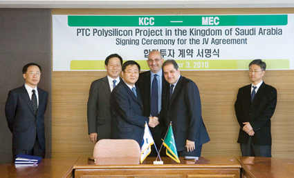 이번 투자계약에 따라 KCC와 MEC는 각각 자본금 1억달러씩을 투자해 사우디에 합작법인 PTC를 설립하고 쥬바일2 산업단지내에 연산 3000t 규모의 폴리실리콘 생산공장을 건설한다.