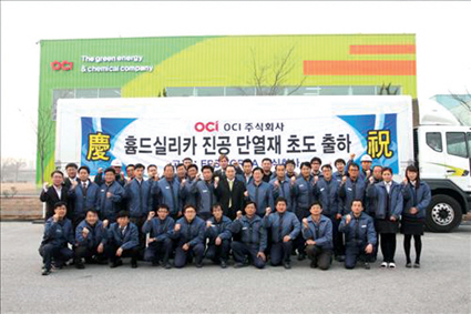 OCI는 지난달 5일 이 회사에서 생산하는 ‘흄드실리카 진공단열재’(FS VIP)가 녹색기술인증을 받았다고 밝혔다. 단열재가 정부의 녹색기술인증을 받은 것은 처음으로 일반 진공단열재는 내부의 유리섬유 단열재와 진공상태를 유지하는 외피재로 이뤄지는데 이 제품은 고순도 흄드실리카로 내부를 채워 단열성능이 8배나 좋다고 OCI는 설명했다.