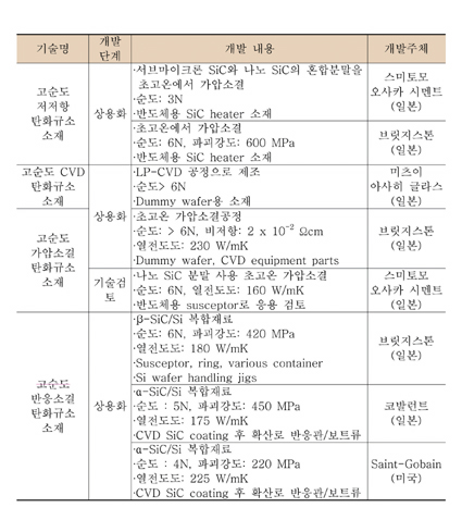 표 2. 반도체 제조공정용 SiC 제품의 해외 기술개발 현황
