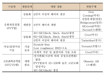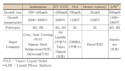 SiC 단결정 성장에 있어서 기존의 GaAs 단결정 성장에서 사용되는 것과 같은 화학양론비가 동일한 액상으로부터 단결정을 성장시키는 액상성장법(Congruent Melt Growth)으로는 원론적으로 단결정 성장이 불가능하기 때문에 승화법(Sublimation), 용액성장법(Liquid Phase Epitaxy, LPE)과 고온기상증착법(High Temperature CVD, HT-CVD) 등 다양한 단결정 제조 방법들이 개발되었다. 이중 가장 대표적인 방법은 승화법이며 현재 양산되는 대부분의 SiC 웨이퍼는 승화법을 개량한 PVT(physical vapor transport)법으로 제조하고 있다.(표 3) Cree와 Dow Corning(미국), 신일본제철과 Bridgestone(일본), SiCrystal(독일) 그리고 Norstel(스웨덴) 등이 이 방법을 이용해 2인치 및 4인치 이상의 SiC 단결정을 제조하는 기술을 보유하고 있다. 그러나 PVT법은 결정성장 속도가 시간당 1mm 정도로 낮은 편이며 성장 중 경시변화가 발생하는 문제점이 있다. 고온 기상증착법은 경시변화가 없고 C/Si 비율의 제어가 상대적으로 용이하며, 아직 기술성숙도가 낮지만 이론적으로 PVT법에 근접한 결정성장속도(1mm/hr 이상)를 얻는 것이 가능한 유망한 방법이다.(표 4) 국내에서는 현재 네오세미테크(주), (주)SKC에서 2인치의 6H-SiC, 3인치의 4H-SiC 웨이퍼에 대한 기초기술 개발을 완료하였으나 고부가가치화가 되기 위한 무결함 2인치, 4인치 및 6인치의 4H-SiC 웨이퍼 개발은 아직 전무한 수준이다.(표 5)
