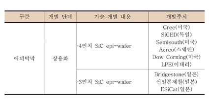 고효율, 고성능의 전력 반도체 소자 특성은 SiC 에피박막의 두께, 도핑농도 등에 의해 결정되며 특히 에피박막의 품질에 의해 소자의 신뢰성이 결정된다. 또한 가격 경쟁력을 얻기 위해 무결함 6인치 단결정 웨이퍼 개발이 필요하다. 특히, SiC 단결정 웨이퍼 내의 결함들에 의해 소자의 오작동에 이를 수 있기 때문에, SiC 단결정 웨이퍼를 기반으로 한 소자가 전기자동차, 하이브리드카, PV 등의 에너지소자 시장으로 진입하기 위해서는 기존의 Si 반도체의 생산성 및 신뢰성에 버금가는 정도의 품질이 필요하다. 하지만, 대구경 단결정 웨이퍼 및 저결함 에피박막 구현이 어려워 이를 극복하기 위한 노력들이 진행되고 있다. 미국의 경우에는 20년 이상의 in-house 연구경험을 보유한 NASA를 주축으로 개발이 진행되어 왔으며 NASA는 최초의 대면적 SiC Epitaxy 성공, 최초의 수 kV SiC 정류기를 시연하였고, Westinghouse, Northrop-Grumman, Motorola, GE, Cree, Advanced Technology Materials, Inc., Kulite Semiconductor, Boston Microsystems, Sienna Technologies, Spire Corporation 등 대전력산업, 방위산업, 반도체산업 분야의 많은 기업체들이 관심을 보이고 있는 실정이다.(표 6) 국내에서는 SiC 박막성장 기초연구 및 에피박막 기판을 적용한 소자 결함에 관한 연구가 서울대와 한국전기연구원에서 진행되어 왔을 뿐, 상업적 개발 연구는 전무하다.