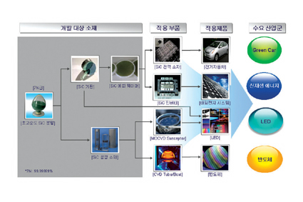 따라서 WPM 사업을 통해 초고순도 SiC 원료 분말부터 소결체, 단결정 및 에피 기판 소재까지의 핵심 원천 기술개발하고 이를 바탕으로 반도체/디스플레이뿐만 아니라 차세대 신성장 동력 산업인 IT, 태양광, LED 및 친환경 에너지 반도체 시장에서 경쟁력 확보를 통해 수요산업의 미래 경쟁력 제고와 국내 소재산업의 활성화라는 상호 시너지효과를 함께 얻을 수 있으며, 세계시장의 선점도 가능할 것이다.