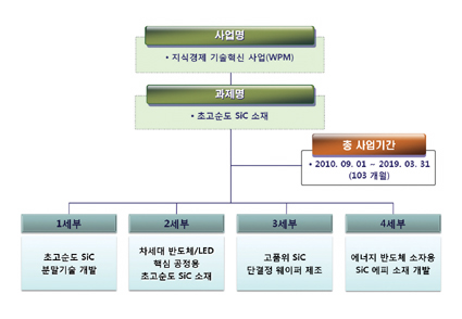 우리나라에서는 세계최고 수준의 소재개발을 지원하기 위한 WPM(World Premier Materials) 사업에서 10대 핵심소재를 선정하여 대규모의 정부지원 및 기업투자가 진행되고 있는데, 이중 제 8과제에 속하는 초고순도 SiC 소재개발 사업은 총 9년 동안 초고순도의 SiC 원료분말로부터 결함제로에 가까운 고품위 SiC 에피웨이퍼까지 차세대 반도체, 디스플레이, 자동차 산업에서 요구되는 초고순도 SiC 소재 전체를 포함하고 있다. 본 사업의 구성을 좀 더 자세히 살펴보면 대기업, 중소기업 및 대학, 연구소를 포함하여 총 22개 기관이 참여하며 초고순도 SiC 분말 기술의 개발과 이를 이용한 차세대 반도체/LED 핵심공정용 초고순도 SiC 소재 제조 기술, 고품위 SiC 단결정 웨이퍼 제조 기술, 그리고 에너지반도체 소자용 SiC 에피 소재 기술로 구성되어 있다.(그림 2)