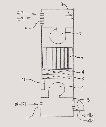실내발생 부유 오염분진이나 미생물, 가스, 냄새등을 다공질 바이오 세라믹 전열교환소자 겸용 필터로 여과 흡착하는 방식으로 실내오염원을 제거하며, 밀폐된 실내의 산소결핍 문제를 해결하기 위하여 필터겸용 전열교환소자로 폐열을 회수한 신선한 외기를 도입하여 쾌적한 실내 환경을 유지할 수 있는 것을 특징으로 하는 환기겸용 바이오세라믹 공기청정기가 제공된다.