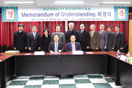 한국세라믹기술원(원장 김경회)과 강남대학교(총장 윤신일)가 지난 1월 28일 우리나라 세라믹기술의 산업화 발전을 위해 도자기술 관련 학술, 연구 교류를 추진하는 내용을 골자로 한 상호 협력에 관한 협약서(MOU)를 체결했다.
