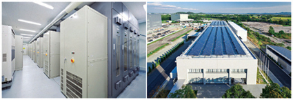 (그림 1) 산요전기의 가사이사업소에서는 리튬이온전지(좌)에 야간전력과 태양광발전(우)의 전력을 저장하여 제어를 최적화함으로써 이산화탄소 25% 삭감을 목표로 한다.