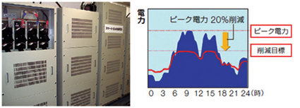 (그림 3) 시미즈건설의 기술연구소 본관에서는 태양전지(14kW)와 납축전지(163kWh, 우)를 설치하여 수요제어를 포함하여 20% 최고치 절약을 통해 이산화탄소 60%를 삭감한다.