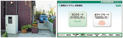 (그림 2) 다이와하우스공업의 실험주택은 축전지(좌)에 야간전력을 저장하는 모드와 태양전지의 전기를 저장하는 eco 모드의 두 가지 패턴을 설정한다.