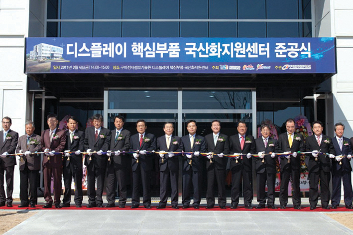 구미시는 지난달 4일 구미국가산업4단지 내 구미디지털정보단지에서 기관단체장, 기업인 등 200여 명이 참석한 가운데 디스플레이 핵심부품 국산화지원센터 준공식을 가졌다. 115억원을 들여 신축된 이 센터는 연면적 4천503m2, 지상 4층 규모로 20종의 제조공정장비와 석·박사급 전문인력, 디스플레이 관련기관·기업·연구소 등이 입주해 터치패널, 기능성 필름, 전극재료 등 디스플레이 핵심부품소재의 국산화 연구개발을 수행한다.