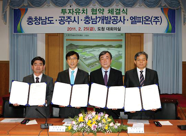 지난 2월 25일 충남도에 따르면 안희정 도지사와 이준원 공주시장, 고성규 엘피온(주)대표가 도청 대회의실에서 충남도와 공주 탄천 일반산업단지 내 13만2000m2(약 4만평) 부지에 태양전지용 폴리실리콘 소재와 웨이퍼 생산 공장을 건설하기 위한 투자협약(MOU)를 체결했다.