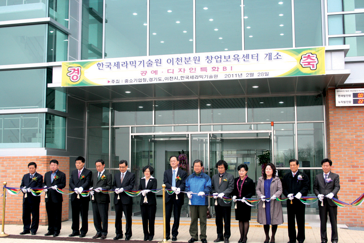 지난 2월 28일 한국세라믹기술원 경기도 이천 분원에서 창업보육센터 준공식이 열렸다. 이 날 행사에는 김경회 한국세라믹기술원장, 조병돈 이천시장, 김진형 경기지방중소기업청장, 강우현 한국도자재단이사장 등이 참석했다. 김경자 이천 분원 분원장은 ‘세라믹기술원 이천 분원은 지난 4년간 도자관련 연구개발 및 기술지원 위주로 운영되어왔다’며 ‘앞으로 창업보육센터는 도자산업활성화 및 신규창업과 전통도자분야의 글로벌화를 위해 노력하겠다’고 말했다. 이어서 조병돈 이천 시장은 ‘앞으로 창업보육센터는 이천 뿐만 아니라 대한민국 도자산업을 이끌어나갈 중요한 역학을 하기 바란다’고 말했다.