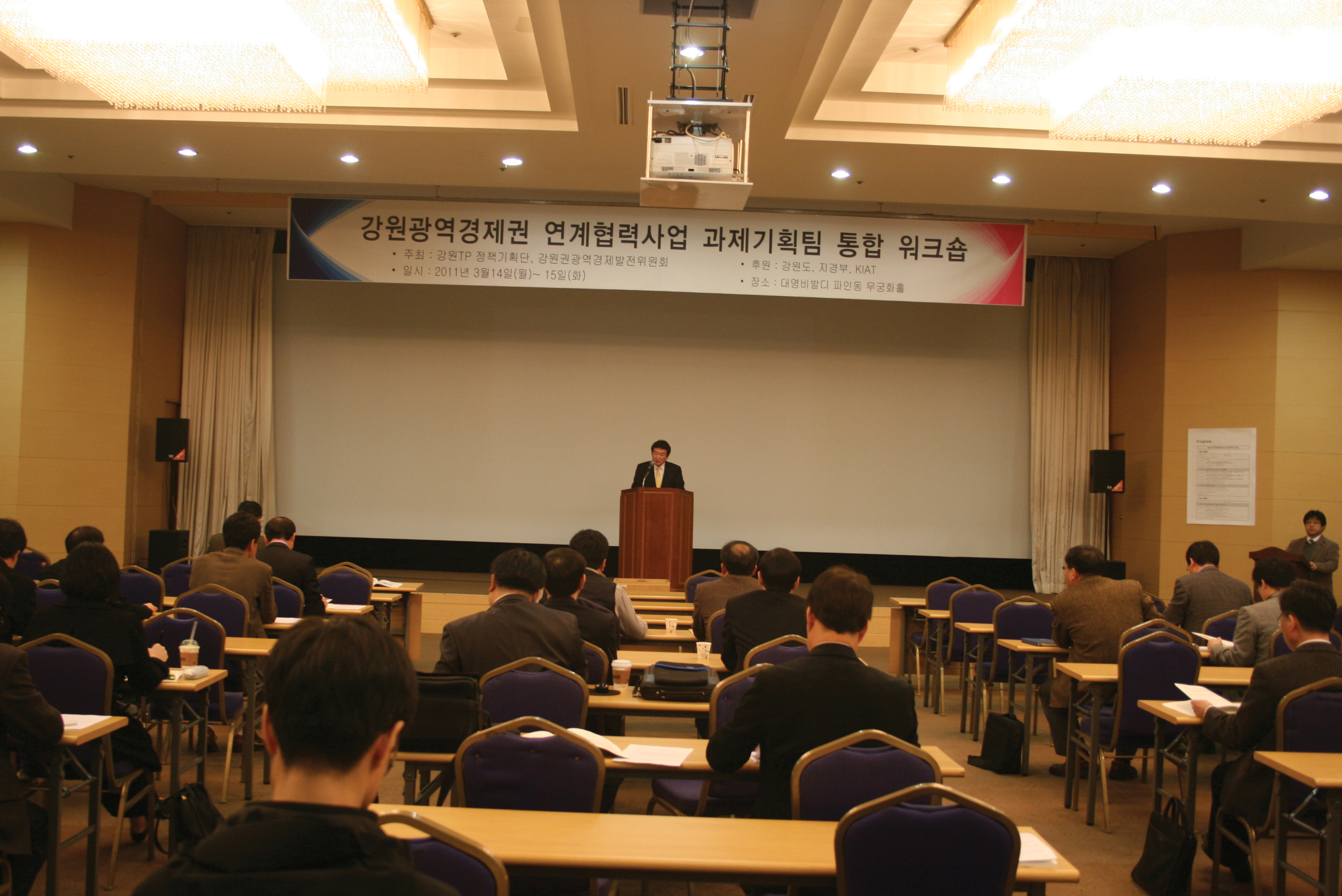 지난달 14일, 15일 양일간 홍천 대명리조트에서는 지식경제부 광역경제권연계협력사업에 참여할 강원도의 3개 과제별 기획팀이 도내 최종평가에 앞서 마지막 점검을 위해 자리를 함께 했다. 이날 사업계획발표는 ▲초광역연계형 구조용 부품소재 상용화개발 및 플랫폼 구축사업(신소재) ▲플라즈마 기술융합 중소형 저전력가스화 / 융용시스템 개발 및 상용화사업(플라즈마) ▲국가재난형 질병에 안전한 바이오 시큐리티 시스템 개발사업(바이오)의 순으로 진행. 이중 첫 번째 신소재 분과가 바로 3개 거점이 AlN소재 국산화를 위해 공동으로 기획한 사업이다. 강원도, 강릉시, 전라남도, 목포시, 대구광역시 5개 지자체가 공동으로 참여하는 이번 사업은 고순도 질화알루미늄 원료 소재의 상용화 기술개발 / 그린카 파워일렉트로닉스용 고방열 직접 동박부착 기판 / 반도체 공정용 AlN 세라믹 히터 모듈 개발 / 질화알루미늄 기능성 방열기판 개발 등 4개 세부과제로 구성. 총 사업비는 300억원 내외가 될 전망이며 사업기간은 3년. 4월 초 강원도 내부평가에 따른 순위가 정해지고 이달 중 지식경제부 최종평가에 따라 당락이 결정될 예정이다.